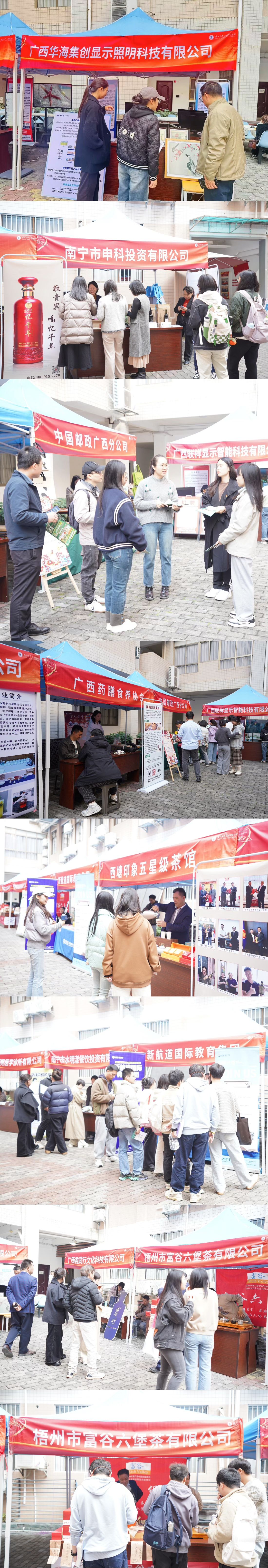 此次校友企业形象展示与招聘活动得到了来自各行各业校友企业的大力支持,涵盖了教育、旅游、养生、茶文化、医疗、口腔、智能科技等多个领域。广西旅发文化旅游股份有限公司通过现场产品演示与企业文化讲解,不仅让师生和校友们了解了行业前沿动态,还让大家亲身体验了一些文创非遗产品,如绣球、壮锦、虎头帽等,别具一格,拓宽了视野。中国邮政广西分公司带来了茉莉花奶茶,清新雅致的茉莉花香与丝滑的鲜奶相融合,每一口都洋溢着幸福的味道,深受现场欢迎。三亩山农业发展有限公司带来了康顺山茶籽系列洗护用品,山茶油富含维生素E和不饱和脂肪酸,深层滋养头发,改善干枯毛糙问题,使头发更加柔顺亮泽,备受师生喜爱。卫君睡眠医学诊所有限公司展示了一款纯植物精油喷雾,现场讲解了睡眠的重要性及促进有效睡眠的方法,吸引了不少关注。新航道国际教育集团与同学们近距离互动,激发了许多同学对未来职业规划的兴趣,提供了宝贵的学习机会。广西爱生多维长寿口腔科技有限公司推出的益生菌口服含片压片糖果,不仅能清新口腔,还能促进肠道蠕动,帮助消化。广西联祥显示智能科技有限公司展示了多款LED显示器、3D照片展示屏等高科技产品,其中闺蜜机随身屏因其强大功能和时尚外观成为全场焦点。广西药膳食养协会现场讲解食物养生之道,并支持更多毕业生创业。南宁市水明漾餐饮投资有限公司专注于婚庆服务,提供了多个就业岗位。广西龙云山茶业集团有限公司带来了明星产品——有机茶与有机奶的独特奶茶,茶香与奶甜的完美融合,深受欢迎。南宁申科酒庄和忆千年酱香白酒也展示了多款红酒与白酒。广西南宁持与茶文化有限公司、梧州市富谷六堡茶有限公司、广西君武行文化科技有限公司、西塘印象五星级茶馆等企业则现场展示了茶艺文化及品茶服务。